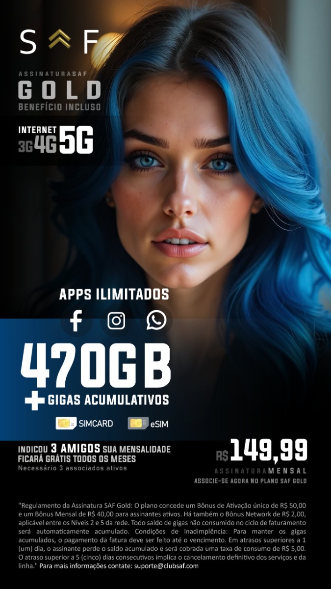 Para ativar o plano 1⁰ - Compre um chip da vivo sem crédito.*(Atenção: não abra e não coloque no aparelho até que finalize todo procedimento)* ou se seu celular tiver E-SIM digite *#06# para pegar o numero SID do seu e-sim 2⁰ - entre no link abaixo e se cadastre https://clubsaf.com/saf/santiago 3⁰ - após cadastrar você será direcionado ao setor de ativação Faça o pagamento do plano escolhido. A SAF é uma comunidade estratégica criada pelo grupo XGOW, com o objetivo claro de engajar pessoas na construção e divulgação do plano de marketing para futuros lançamentos, como uma plataforma de marketplace, uma rede social e soluções de mobilidade urbana. sim um benefício adicional, utilizado para potencializar e promover os futuros projetos do ecossistema SAF/XGOW. Importante: Devido ao fato de o objetivo da empresa *não estar relacionado ao setor de Telecom*, *não há necessidade de autorização de nenhuma operadora ou órgão regulador para comercializar as assinaturas da SAF*. Sempre existe um jeito novo de conectar Como tudo Surgiu? Há 8 anos atuamos no mercado de internet empresarial, oferecendo soluções para Pessoas Jurídicas (PJ). Desde o início, sempre tivemos o desejo de levar esse benefício também ao público em geral. No entanto, a burocracia e a exigência de um score de crédito elevado resultavam na reprovação de 90% dos interessados. Foi então que tivemos um insight valioso: criar uma forma de ajudar as pessoas a conquistar sua liberdade financeira, ao mesmo tempo em que simplificávamos o processo de acesso. Assim nasceu a Comunidade SAF — uma iniciativa para compartilhar benefícios de maneira legal, justa e acessível. Venha fazer parte cadastre para receber os benefícios https://xgow.in/saf/santiago acessar site: https://clubsaf.com Ativar Plano: https://clubsaf.com/ativomensal Mais informações: (13)9 9765-1874 WhatsApp Claudionor Santiago